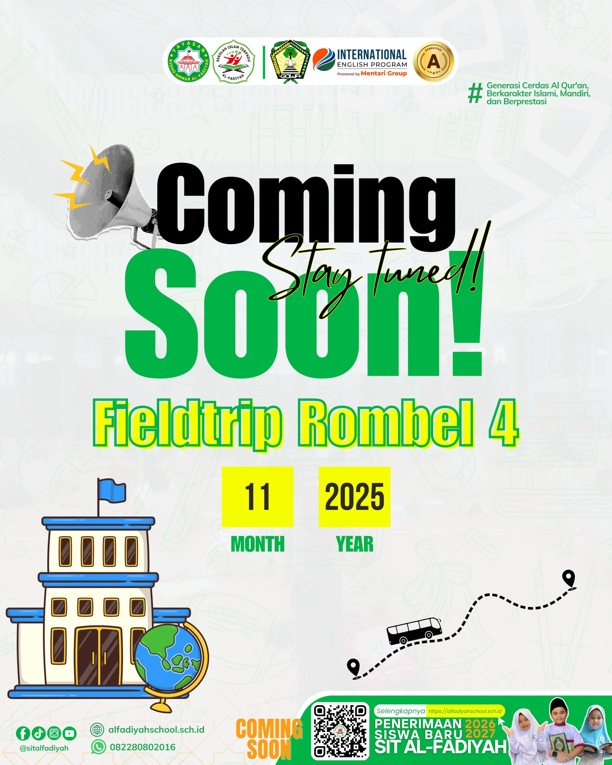 🚌 COMING SOON! Fieldtrip Rombel 1📅 17 November 2025 Siapkan diri untuk pengalaman belajar seru di luar kelas! 🌿✨Tetap pantau informasinya, ya—fieldtrip spesial untuk ananda Rombel 1 segera hadir! 🎒💚 #SITALFadiyah #Fieldtrip2025 #Rombel1 #BelajarDiLuarKelas #SeruDanBermanfaat #GenerasiCerdasAlQuran